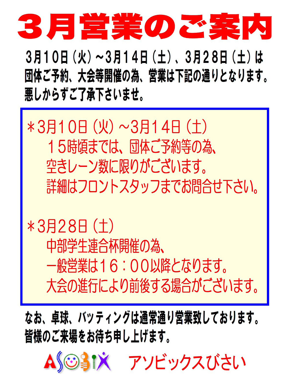 3月の営業案内